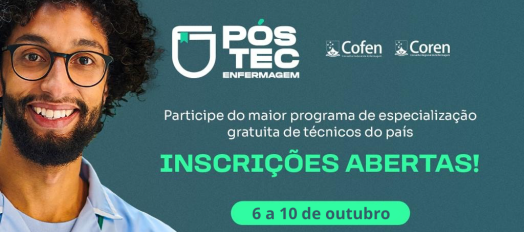 Estão abertas as inscrições para a quarta edição do Pós-Tec Enfermagem, o maior programa de especialização técnica de nível médio gratuito do Brasil. As inscrições ocorrem exclusivamente por meio da plataforma CofenPlay+ até as 23h59 (horário de Brasília) do dia 10 de outubro. São dez mil vagas ofertadas neste quarto edital, distribuídas em dez cursos de especialização. As vagas serão preenchidas por ordem de inscrição. Confira o edital.
