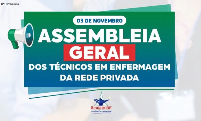 A direção do Sindicato dos Auxiliares e Técnicos em Enfermagem do Distrito Federal (Sindate-DF) convocou formalmente os profissionais da iniciativa privada para participarem da Assembleia Geral (AG) no dia 03/Nov. O encontro está marcado para as 14h30 e ocorrerá de forma híbrida, com opções de presença na sede da entidade e por meio online, com o propósito de debater a data-base da categoria e pautas correlatas.